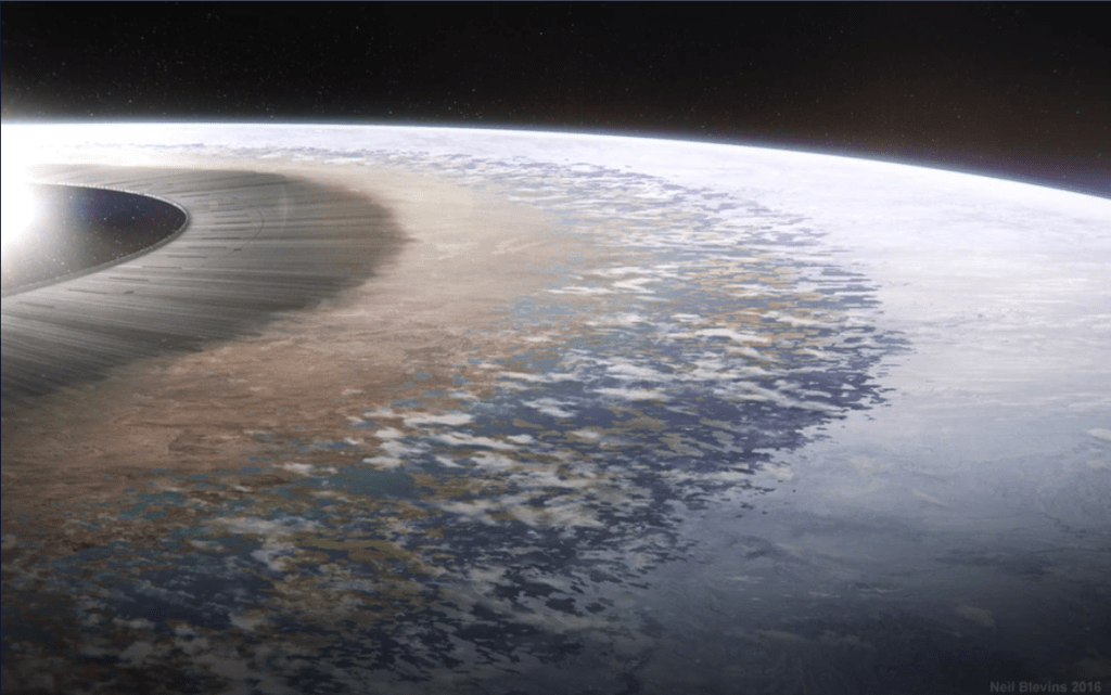 Day and night cycles are regulated by the sun ‘bobbing’ up and down between the top and bottom of the disc. Sun movement would be visually limited to the horizon. In place of moving the star, shade panels can be installed to provide to provide day/night slices across the disc.